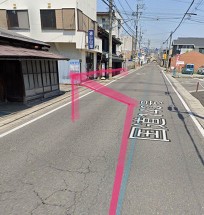 遠山印章さんの手前を左に曲がってください。月極め駐車場と看板がありますが少し分かりにくいです。